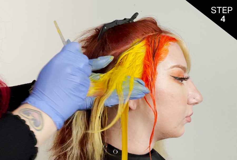 Section out the lightened perimeter and apply the ChromaSilk VIVIDS Formulas to the first side of the head—Formula 1 closest to the face, then Formula 2 to the middle and then Formula 3 in the back in equal size sections. Mirror on the other side.