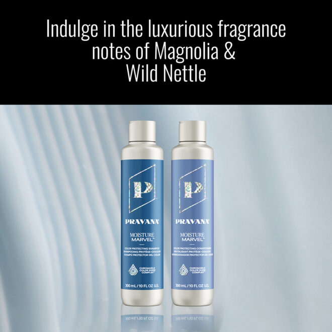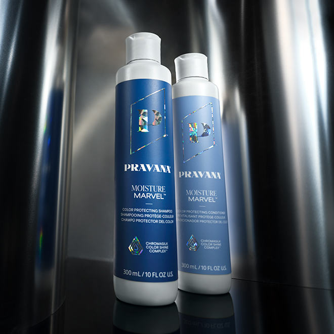 Nourish, hydrate, and restore moisture in color treated hair with PRAVANA Moisture Marvel Shampoo and Conditioner System. Formulated with Hyaluronic Acid and ChromaSilk Color Shine Complex™.